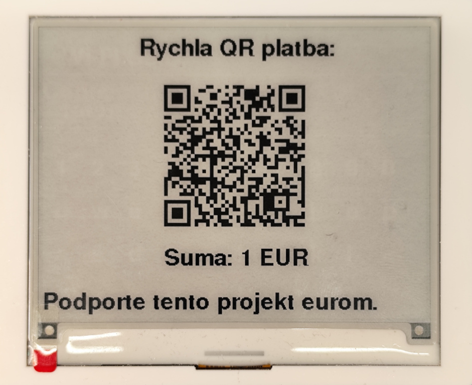 Display pre rýchle platby alebo QR platby. Display sa predáva už s nahratým software pre rýchle platby. Platbu je možné zadať cez webové rozhranie. Display sa pripája k sieti pomocou Wi-Fi. Do prehliadača potom stačí zadať IP adresu display-a a zobrazí sa formulár pre zadanie platby. V nastaveniach je možné upraviť názov siete Wi-Fi, heslo siete, IBAN, názov prijímateľa účtu, poznámku pre prijímateľa a variabilný symbol. Na display-i sú aj tlačidla Menu, hore, dole, OK a Exit s ktorými je možné urobiť aj prvotné nastavenia. Ak sa display do 30 sekúnd nepripojí k Wi-Fi sieti, tak sa spustí režim AP (Acess point). Potom je možné sa k display-u pripojiť mobilom alebo tabletom priamo a urobiť tak prvotné nastavenia. Display sa napája štandardným 5V adaptérom cez USB-C konektor. Display je typu e-paper. To znamená, že aj po odpojení napájania bude stále zobrazovať QR kód. Preto je tento display vhodný aj na požitie platby darov a dotácií.