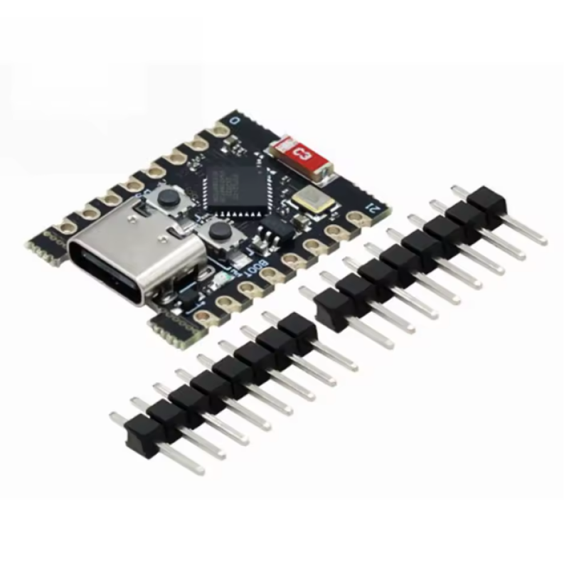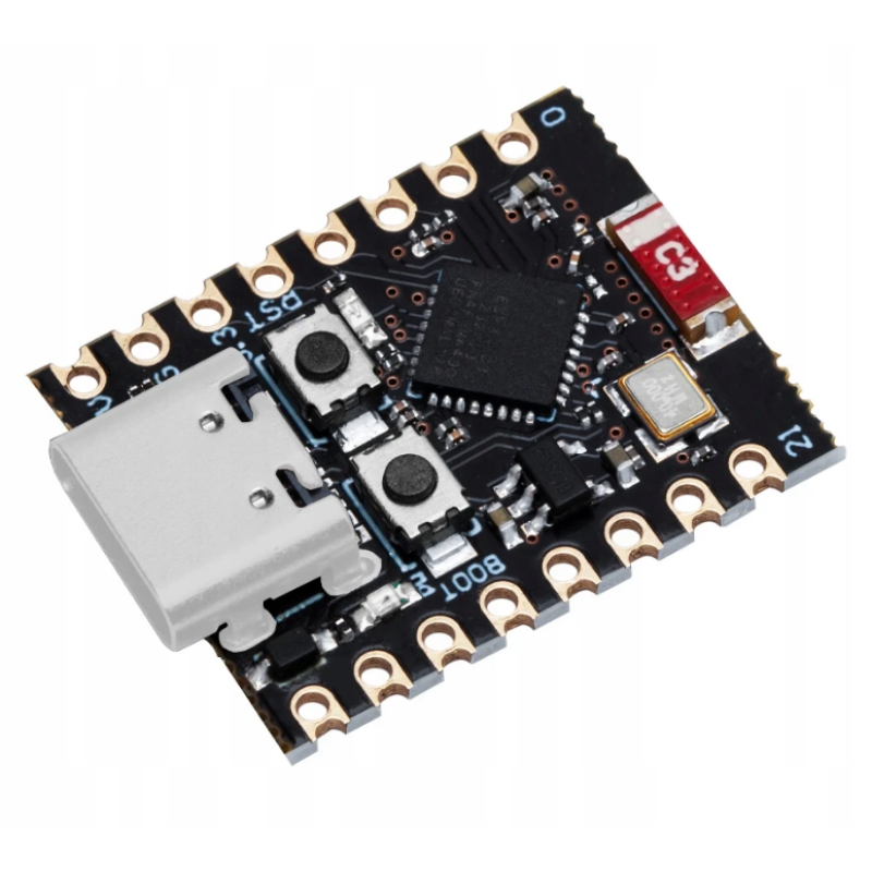 ESP32C3 SuperMini je miniatúrna vývojová doska pre IoT založená na duálnom čipe Espressif ESP32-C3 WiFi/Bluetooth. ESP32-C3 je 32-bitový procesor RISC-V s FPU (jednotkou s pohyblivou desatinnou čiarkou) schopný 32-bitovej aritmetiky s jednoduchou presnosťou, čo poskytuje výkonné výpočtové možnosti. Pýši sa vynikajúcim RF výkonom a podporuje protokoly IEEE 802.11 b/g/n WiFi a Bluetooth 5 (LE). Doska obsahuje externú anténu na zvýšenie sily signálu pre bezdrôtové aplikácie. Má kompaktný tvar a jednostranný dizajn pre povrchovú montáž. Je vybavená bohatou škálou rozhraní vrátane 11 digitálnych I/O pinov, ktoré možno použiť ako PWM piny, a 4 analógových I/O pinov, ktoré možno použiť ako ADC piny. Podporuje štyri sériové rozhrania: UART, I2C a SPI. Doska má tiež malé tlačidlo reset a tlačidlo režimu bootloaderu.